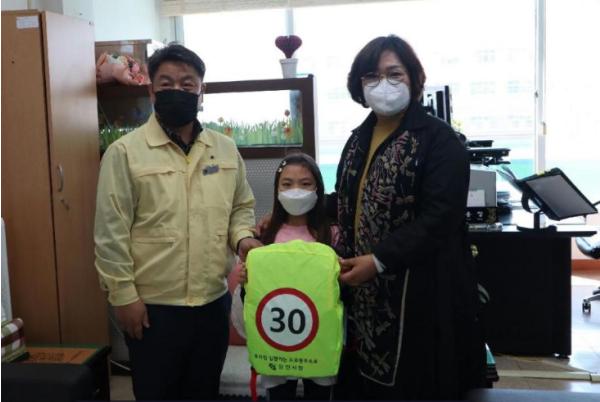 당진시는 민식이법 시행과 동시에 스쿨존 교통사고 예방에 기여하고 미래 주소 사용 세대인 아이들에 도로명주소를 홍보하고자 관내 초등학교 1학년 학생 2,000여명을 대상으로 가방안전덮개를 배부했다.