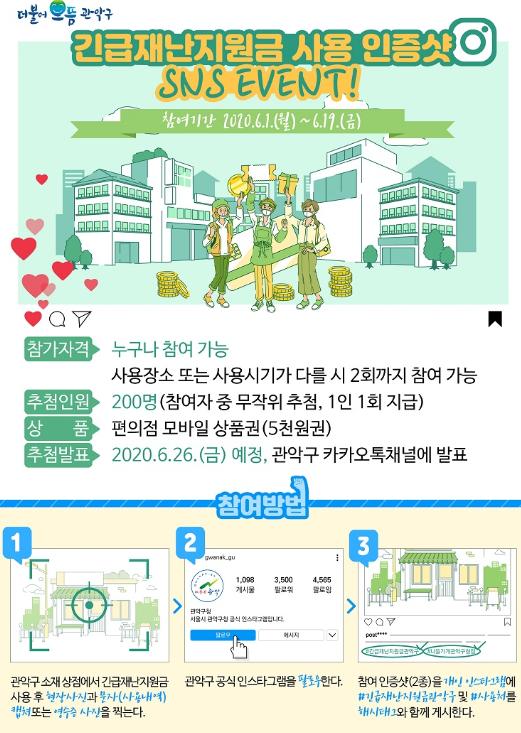‘긴급재난지원금 사용 인증샷’ S.N.S 이벤트는 6월 1일(월)부터 6월 19일(금)까지 관악구 공식 인스타그램을 통해 진행된다.