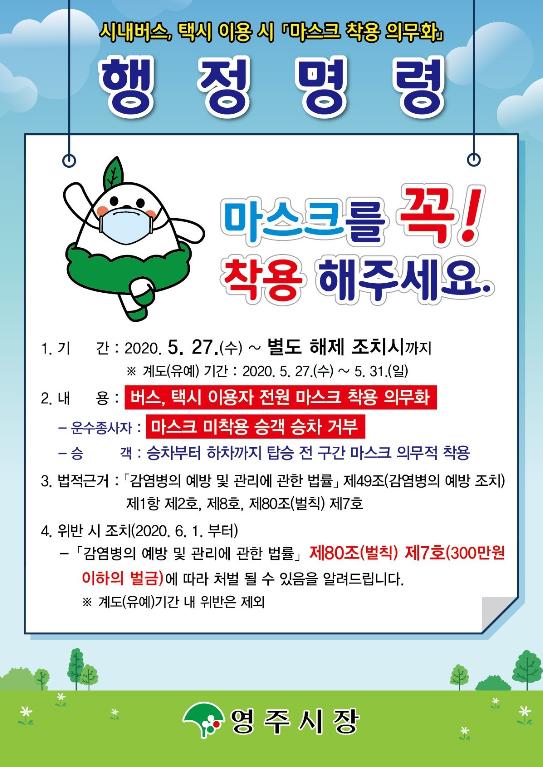 경북 영주시(시장 장욱현)는 오는 6월 1일부터 ‘코로나19’ 확산 방지를 위해 시내버스 및 택시 이용하는 모든 승객에 대해 마스크 착용을 의무화하는 행정명령을 시행한다고 밝히고 이를 적극 홍보하고 있다.