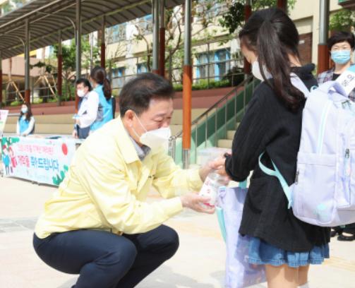 캠페인 참여자들은 어린이들의 건강한 성장을 응원하는 의미를 담아 학생과 학부모들에게 마스크, 항균 물티슈, 코로나19 예방 생활수칙 안내문을 전달했다.