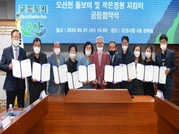 오산시(시장 곽상욱)는 지난 27일 시청 상황실에서 각급 사회단체가 참여한 가운데 시민이 중심이 되고 시민 스스로 참여해 하천을 아름답게 가꾸는 ‘오산천 돌보미 및 작은정원 지킴이 공동 협약식’을 가졌다.