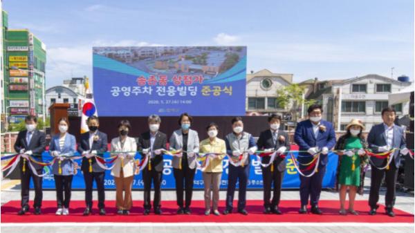대전 대덕구(구청장 박정현)가 지난 27일 점포 800곳이 입점해 있는 송촌동 상점가 상인들의 숙원사업인 공영주차 전용 빌딩 공사를 마무리하고 주민, 상인, 지역 정치인 등 150여 명이 참석한 가운데 준공식을 개최했다.