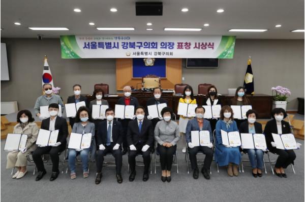 강북구의회(의장 이백균)는 지난 5월 25일 의회 본회의장에서 강북구립 실버합창단, 강북구립시니어합창단, 강북구립소년소녀합창단 소속 16명의 단원들에 대한 표창 수여식을 가졌다. 이번 행사에 수상자를 축하하기 위해 유인애 부의장과 강북문화재단 유인선 이사장도 함께 참석했다.