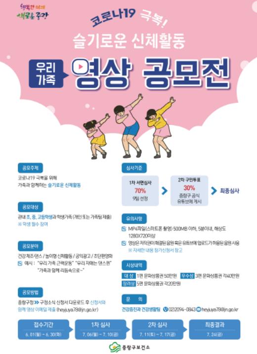 서울특별시 중랑구(구청장 류경기)는 코로나19 장기화로 지친 학생들과 가족들의 건강관리를 위해 ‘슬기로운 신체활동’ 영상 공모전을 6월 1일부터 개최한다고 밝혔다.