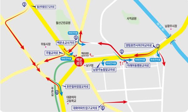또한, 백운고가차도 교차로 내 1곳(동아병원→백운초교 방면)은 좌회전 금지시키고, 백운광장 주변 5곳에 대해서는 좌회전을 허용하는 등 주변 신호체계를 변경한다.