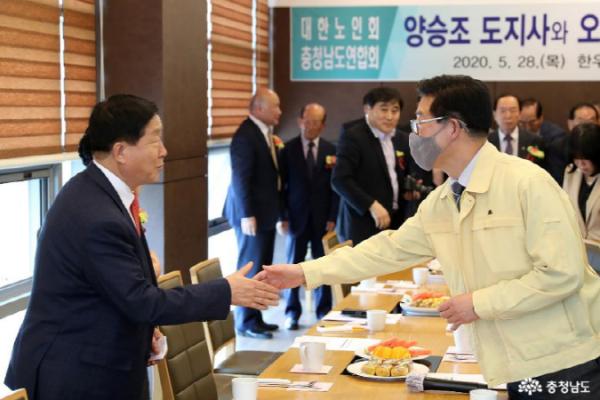충남도는 28일 양승조 지사와 대한노인회 충남연합회가 참석한 가운데 간담회를 열고, 노인 복지 등 도정 발전에 대해 논의했다.