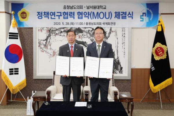 유병국 의장은 “도정?교육행정의 복잡?다양화로 의정활동 전문성 강화가 요구되는 시점에 전문성 있는 교수진을 보유한 남서울대와 힘을 모으게 돼 기쁘다”면서 “이번 협약은 향후 충남 의정과 자치발전을 위한 공동연구 수행에 중요한 토대가 될 것”이라고 말했다.