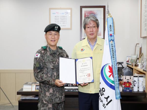 제8098부대 4대대장(권길주 중령)은 28일 정읍시청을 방문해 국무총리 기관 표창과 함께 포상금 60만원을 전달했다.
