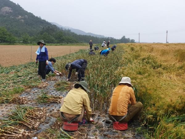처음 5. 26(화)일 군서면, 총무과, 보건소 직원 30명이 마늘수확 일손돕기를 시작으로, 5. 27(수)에는 시종면, 축산과, 안전건설과 직원 35명이 양파수확 일손돕기를 추진하였다.