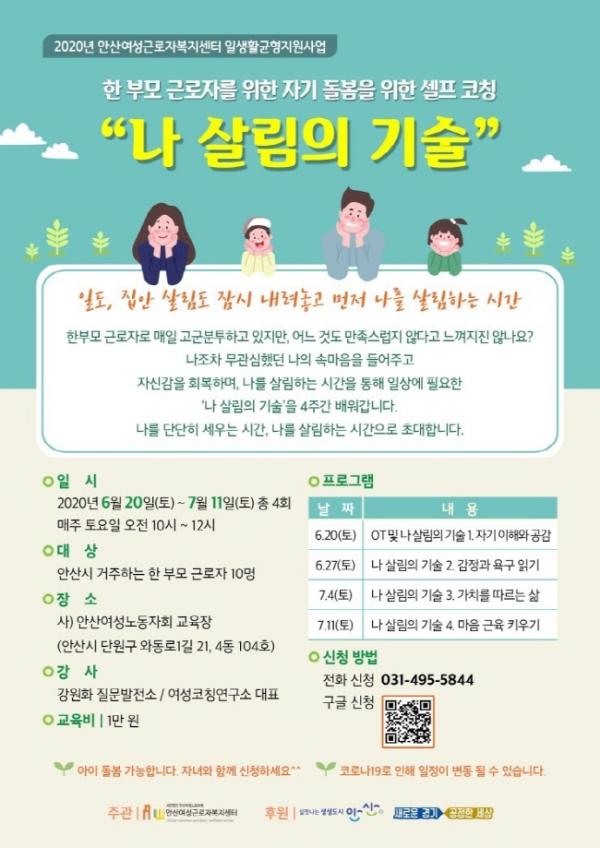 안산여성근로자복지센터(센터장 김두리)는 다음달 12일까지 한부모 근로자를 대상으로 한 셀프코칭 ‘나 살림의 기술’ 프로그램의 참가자를 모집한다고 29일 밝혔다