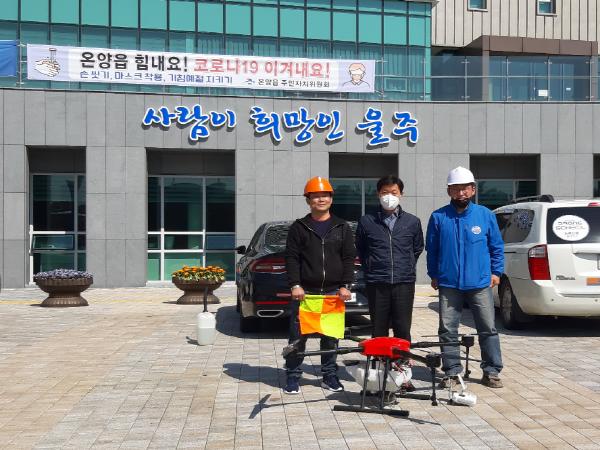 온양읍에서는 지역사회보장협의체, 주민자치위원회, 온양읍 청년회 등 각종 단체에서 릴레이식으로 자율적 방역 봉사가 이어지고 있는 가운데 이제는 지역 주민 2명이 4월 6일부터 4월 말까지 드론 방역을 시작했다.