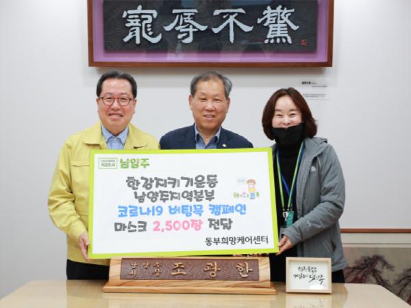 (사)한강지킴이운동 남양주지역본부(본부장 남궁완)는 6일 코로나19 극복을 위한 마스크 2,500매를 남양주시 동부희망케어센터에 전달했다.