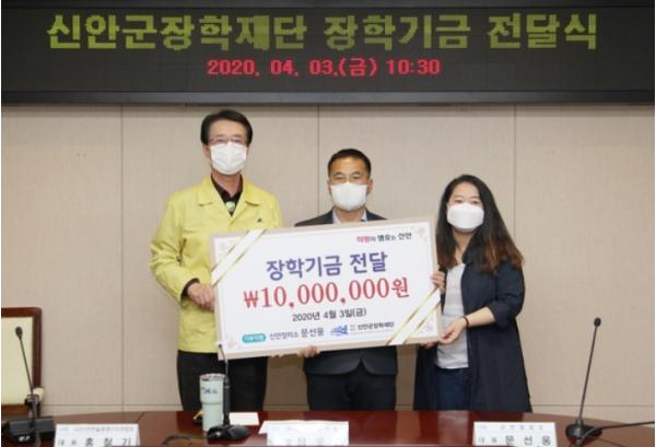 신안정미소 문선웅·양지은 부부가 신안군장학재단(박우량 이사장)에 1천만원의 장학기금을 기탁한데 이어, (사)신안천일염생산자연합회 홍철기 대표도 3일 신안군청을 방문해 지역인재육성을 위해 써달라며 장학기금 1천만원 기탁을 약정하고 500만원을 전달했다.