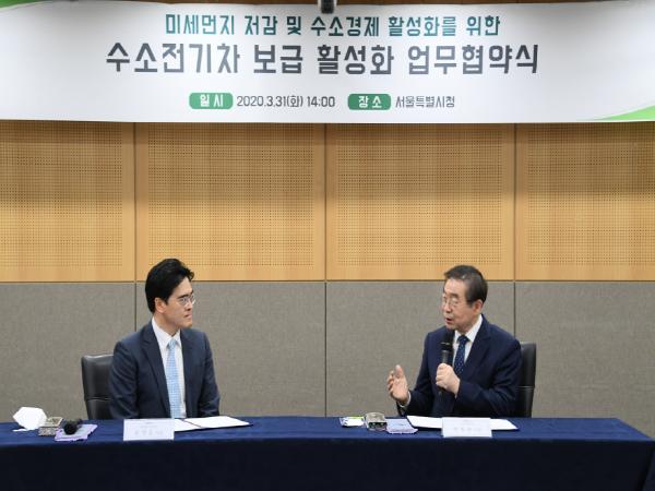 박원순 서울시장은 공영운 현대자동차(주) 사장과 3월 31일(화) 서울시청에서 만나 수소경제 활성화 방안을 논의하고 ‘친환경 수소전기차 및 수소충전 인프라 보급 등에 관한 양해각서’를 체결했다. 현대자동차와 서울시가 만나 미세먼지 저감과 수소경제 활성화를 위한 상호 협력을 하겠다는 취지이다.