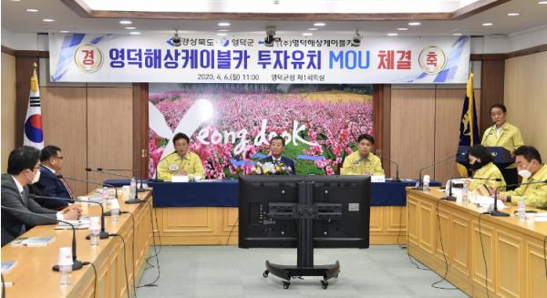경상북도는 6일 영덕군청에서 ㈜영덕해상케이블카와 경상북도·영덕군 간 377억원 규모의 ‘영덕 해상케이블카 사업’ 투자양해각서(MOU)를 체결했다고 밝혔다.