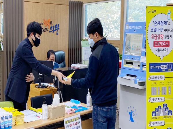의왕시(시장 김상돈)는 6일부터 코로나19 확산 방지와 도로명주소 홍보를 위해 휴대용 손세정제와 도로명주소 홍보 리플릿을 제작해 배부하고 있다고 밝혔다.
