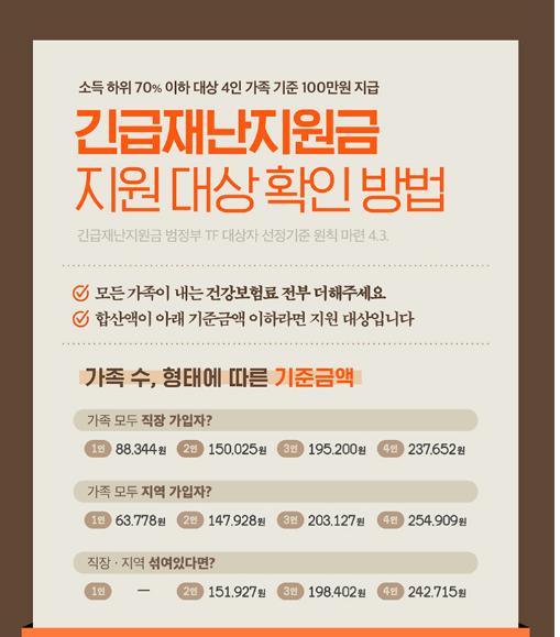 긴급재난지원금은 소득 하위 70% 이하 대상 4인 가족 기준 100만원 지급합니다.