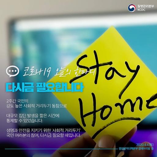 2주간 국민의 강도 높은 사회적 거리두기 동참으로 대규모 집단 발생을 짧은 시간에통제할 수 있었습니다.