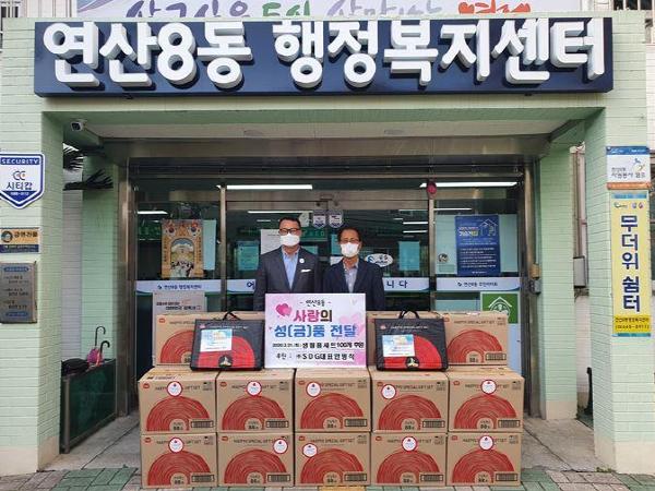 연제구 연산8동(동장 황학진)은 ㈜SDG(대표 안병직)로부터 지난 31일 저소득층 이웃돕기 성품으로 생필품 세트 100개를 지원받았다.