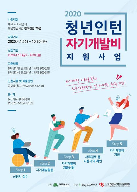 대구시는 ‘2020년 대구 사회적경제 청년인턴사업’ 참여자를 대상으로 직무역량강화를 위한 자기개발비를 10월까지 1인당 최대 30만원 범위 내에서 지원한다.