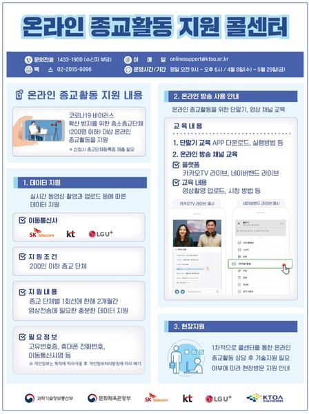 온라인 종교활동에 어려움이 있는 중소 종교단체는 한국통신사업자연합회(KTOA) 누리집에서 안내서를 내려 받을 수 있으며, 전화(국번 없이 ☎ 1433-1900)로도 상세하게 안내받을 수 있다.