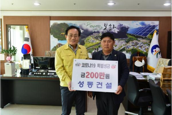 봉화군 성동건설(대표 채영주)에서 4월 7일(월) 봉화군청을 방문하여 코로나19 극복을 위해 써달라며 성금 200만원을 기탁했다.