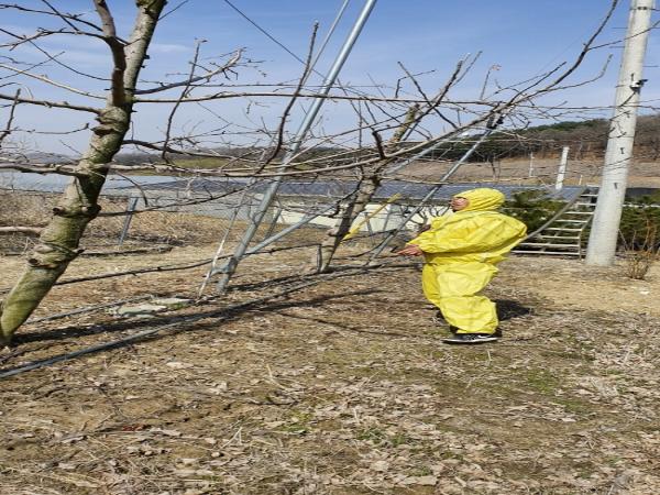 이를 위해 군은 배·사과를 재배하는 88농가 69.2ha에 예방약제를 무상 지원하고 농작업에 사용되는 전정가위와 소독제를 보급하고 있다.