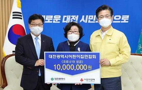대전광역시어린이집연합회(회장 이애란)는 7일 오전 11시 시청 응접실에서 코로나19로 모두가 어려운 시기를 극복하는 데 써 달라며 어린이집 원장 및 보육교사들이 모은 성금 1,000만 원을 기탁했다.