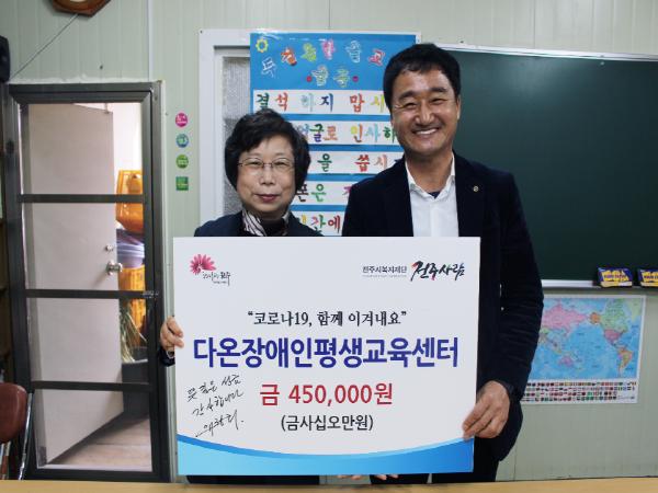 8일 다온장애인평생교육센터는 코로나19 위기 극복을 위한 성금 45만원을 전주시복지재단 ‘전주사람’에 기탁했다.