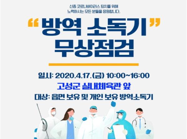 고성군(군수 백두현)은 하절기 감염병 방제관리를 위한 방역소독기 일제점검 및 무상 수리를 고성군 실내체육관 앞에서 4월 17일 오전 10시 부터 오후 4시까지 실시한다고 밝혔다.