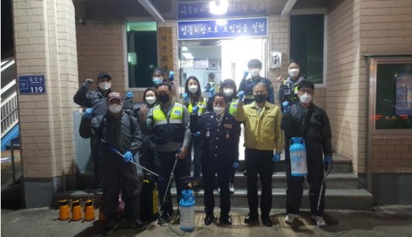 김천시가 코로나19 종식을 위해 총력을 기울이는 가운데 평화남산동 역전자율방범대(대장 임재동)는 방역의 고삐를 늦추지 않기 위해 방범대장 등 10여 명과 함께 방역 활동에 나섰다.