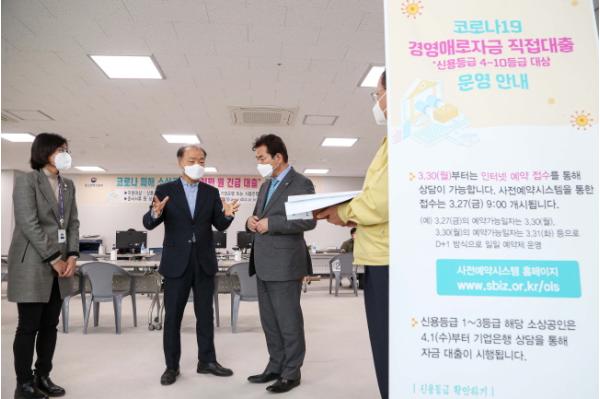 백군기 용인시장은 7일 처인구 삼가동 용인시민체육공원에 마련된 소상공인 직접대출 용인임시센터에서 조봉환 소상공인시장진흥공단 이사장을 만나 이같이 요청했다.