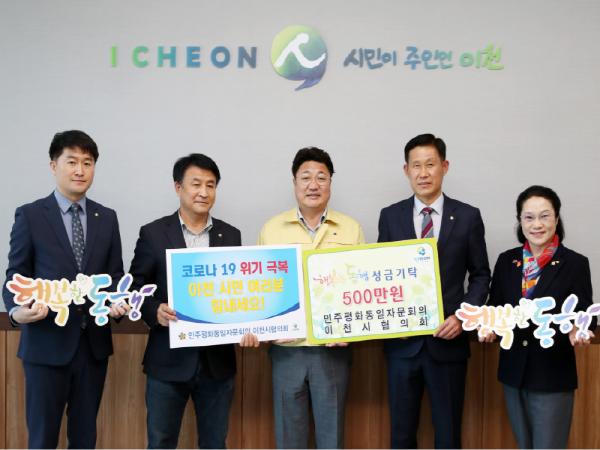 지난 6일 코로나19 위기를 함께 극복하고자 민주평화통일자문회의 이천시협의회(회장 이종창)에서 500만원, (사)평화여성연합 이천지부 일본부인회(시지부장 아미오 미찌에)에서 120만원을 각각 이천시 행복한 동행에 기탁해 왔다.