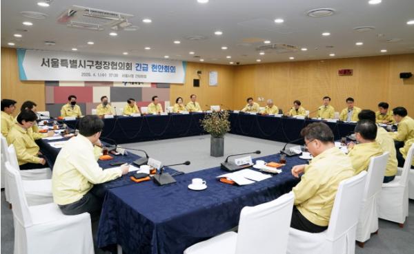 서울시구청장협의회는 1일 오전 서울시청 8층 간담회장에서 18개 자치구 구청장과 조희연 서울시교육감, 조인동 서울시 기획조정실장 등이 참석한 가운데 긴급회의를 가졌다.