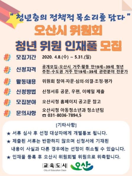 신청 자격은 오산시에 거주하거나 활동하는 만19 ~ 39세 청년으로, 위원회의 특성상 관련분야에 대한 전문학식과 경험이 풍부한 청년을 중점적으로 모집할 계획이다.