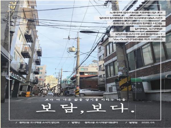 ‘보담,보다’는 중화2동 도시재생지원센터에서 도시재생활성화지원 코디네이터((주)아트버스킹)와 주민들로 구성된 인턴 코디네이터들이 함께 힘을 모아 발행한 소식지로 현재 추진 중인 중화2동 도시재생에 대한 소식들로 구성되어 있다.