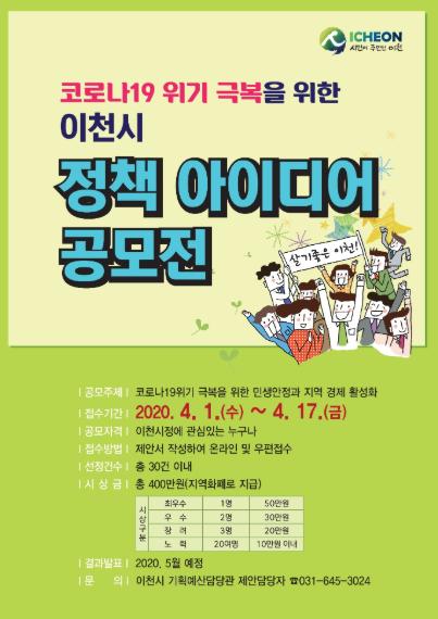 이천시(시장 엄태준)는 4월1일부터 4월 17일까지 코로나19 위기 극복을 위해 『2020년 이천시 정책 아이디어 공모전』을 진행한다고 밝혔다.
