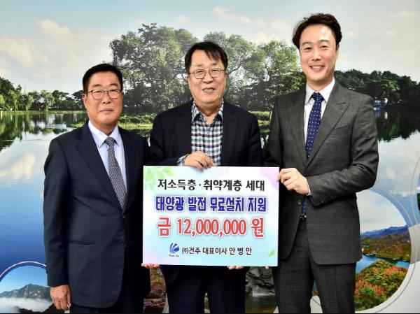 ㈜건주의 안병만(66) 대표이사는 8일 이상천 시장을 내방해 제천지역 취약계층 2가구에 총 1,200만원 상당의 가정용 태양광발전설비(3kw)의 설치 및 5년간 유지보수를 지원하기로 했다.