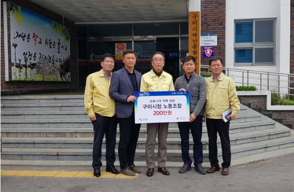 구미시청노동조합(위원장 어상훈)은 2020. 4. 10.(금) 구미시 재난안전대책본부에서 경북사회복지공동모금회에 코로나19 확산방지를 위하여 2백만원을 전달했다.