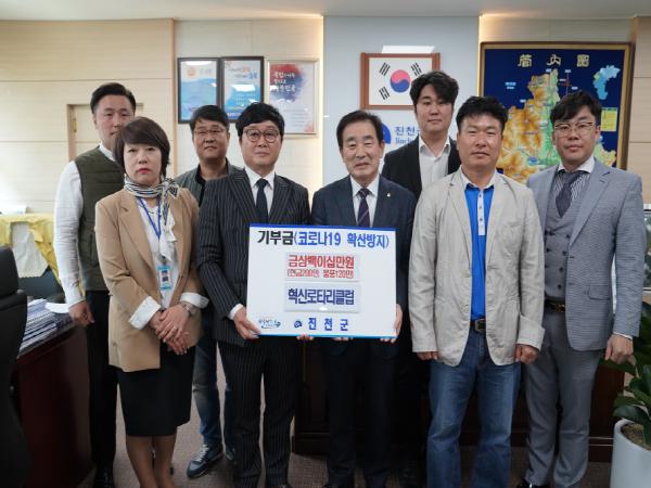 진천 혁신로타리클럽은 10일 진천군청을 방문해 코로나19 감염증 확산 방지와 지역 취약계층 지원에 사용해 달라며 후원금 200만원과 120만원 상당의 물품을 기탁했다.
