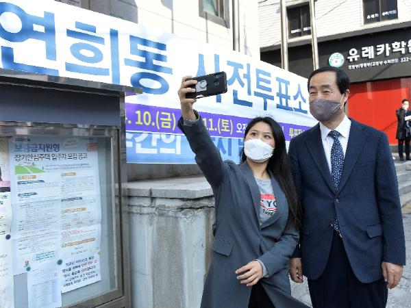 문석진 서대문구청장이 10일 오전 8시 30분 연희동주민센터에 마련된 투표소에서 제21대 국회의원 선거 사전 투표를 한 뒤, 한 주민의 인증샷 촬영 요청에 응하고 있다.