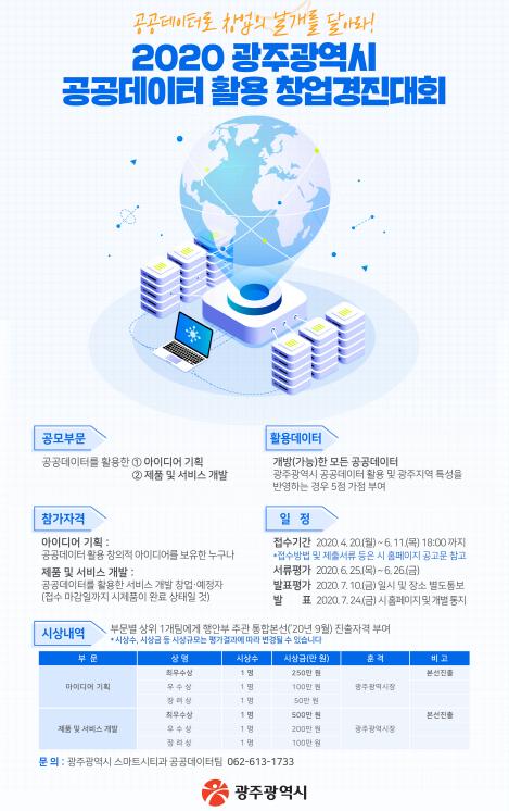 광주광역시는 공공데이터를 활용한 창의적 아이디어와 비즈니스 모델을 발굴하기 위해 ‘2020년 광주시 공공데이터 활용 창업경진대회’를 개최한다.