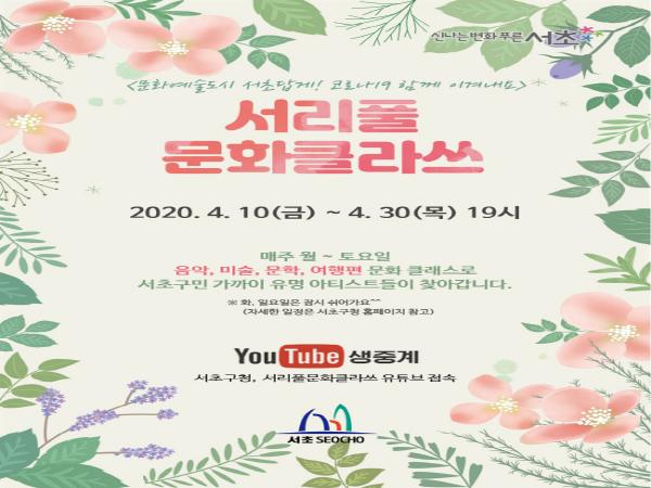 먼저 ‘서리풀 문화클라쓰‘는 음악, 미술, 문학, 여행 네 가지 테마로, 서초구청 공식 유튜브를 통해 온라인 라이브방송으로 볼 수 있으며, 코로나19로 인해 문화시설이 폐쇄되어 마음이 지쳐있는 구민들에게 예술을 통한 힐링의 시간을 선사할 예정이다. 특히 소통행정 1위 서초구민인 만큼 유튜브를 시청하는 구민들과 아티스트간의 댓글소통이 이루어진다. 이를 통해 구민들이 적극적으로 문화예술에 참여하고 작품에 대한 이해를 높일 것으로 기대한다.