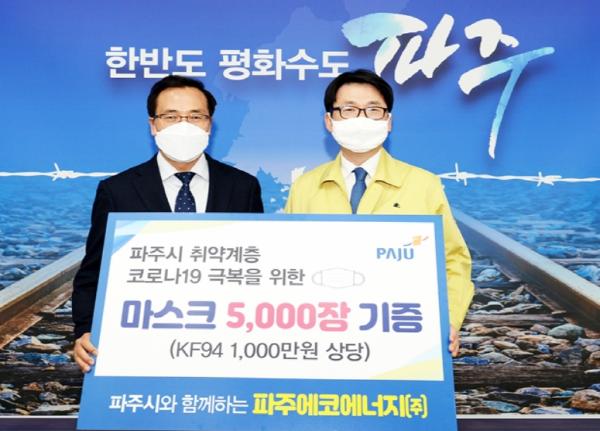 파주시는 10일 파주에코에너지㈜(대표이사 홍동표)가 마스크 5,000장을 구입해 기탁했다고 밝혔다.