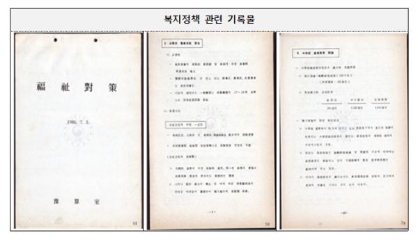 복지정책 관련 기록물은 국민건강보험, 중학교 의무교육, 국민연금 등 복지제도를 시행하기 위한 재원소요 및 대책 등을 포함하고 있어 우리나라 복지제도의 연혁, 정책방향, 상세내용을 살펴볼 수 있다.