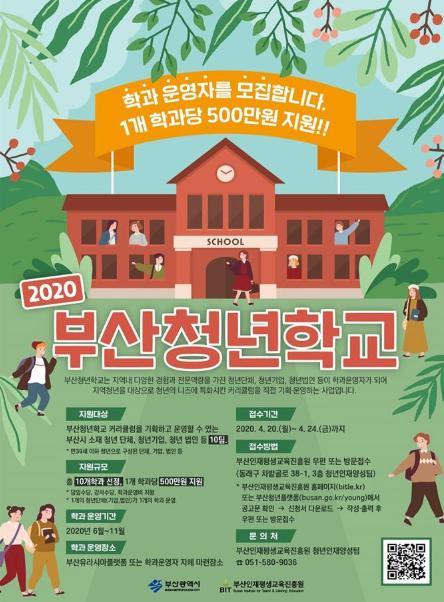 부산시(시장 오거돈)는 청년들의 사회참여 촉진 플랫폼인 2020년「부산청년학교」를 이끌어나갈 10팀의 학과운영자를 모집한다고 밝혔다.