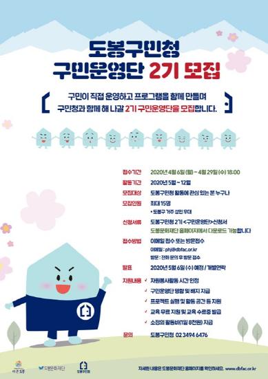 이에 구는 지역과 도봉구민청을 잇는 소통 창구이자, 교류 역할을 수행할 구민운영단 2기를 모집한다. 이들은 올해 5월부터 12월까지 8개월간 활동할 예정이다.