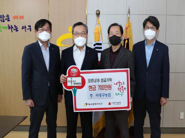 서대구농업협동조합(조합장 이윤영) 이윤영 조합장과 손익수 상임이사는 9일 서구청을 방문해 코로나19로 어려움을 겪고 있는 분들에게 따뜻한 위로의 말을 전하며 성금 700만원을 전달했다.