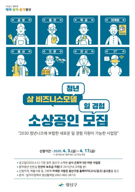 광주광역시 광산구(구청장 김삼호)가 ‘청년 삶 비즈니스모델 일경험 지원사업’과 ‘중소기업 재직청년 취업유지수당 지원사업’ 참여 청년·소상공인을 모집한다.