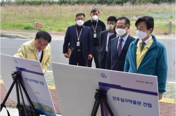 조규일 진주시장은 10일 2022년 개관을 목표로 건립을 추진 중인 진주실크박물관 건립 현장을 방문하여 추진상황을 점검하고, 한국실크 연구원을 방문하여 코로나19 위기 극복을 위한 실크업계의 다각화 방안 등을 논의했다.